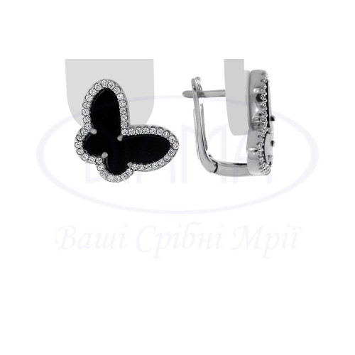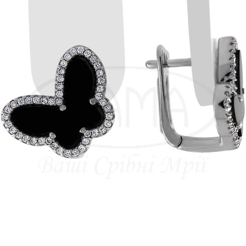 Сережки срібні з Оніксом та білим цирконом. Срібло 925 проби, покрите родієм. Сережки виготовлені в формі "Метелик". В наборі присутні каблучка, сережки та підвіска. Розмір метелика 17*13 мм.
