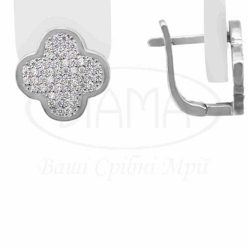 Сережки срібні з Цирконом, виконані у формі "клевер". Срібло 925 проби, покрите родієм. Комплект складається з каблучки, підвіски та сережок. Розмір клевера 13,5 мм