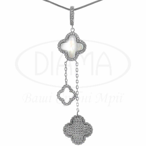 Срібна підвіска з білим Перламутром та цирконом. Срібло 925 проби, покрите родієм. Комплект виготовлений в формі Конюшини, складається з каблучки, підвіски та сережок.