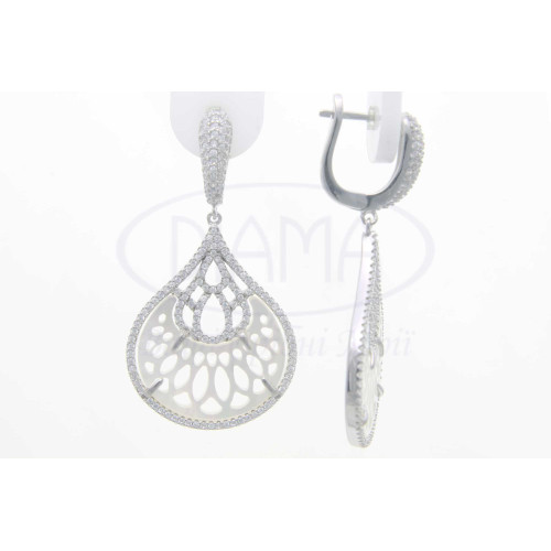 Срібні сережки з білим перламутром та білим цирконом. Срібло 925 проби, покрите родієм. Комплект складається з каблучки, сережок та підвіски.