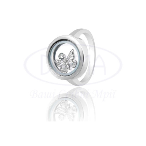 Срібна каблучка з "Бабочкою" та білим цирконом під склом. Срібло 925 проби, покрите родієм. В наборі є каблучка, сережки та кольє.