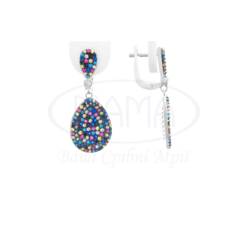 Сережки срібні у формі краплі з кольоровим цирконом. Срібло 925 проби,покрите родієм. У наборі присутні каблучка, сережки та підвіска.