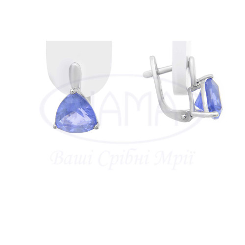 Срібні сережки з Танзанітом в формі трикутника. Срібло 925 проби, покрите родієм. В наборі присутні каблучка, сережки та підвіска. Розмір головного елементу 10*10 мм.