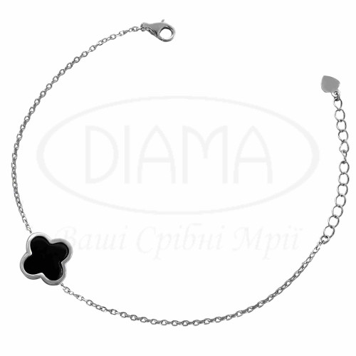 Браслет срібний з чорним оніксом в формі Клевера. Срібло 925 проби, покрите родієм. Розмір головного елементу 13,5 мм.