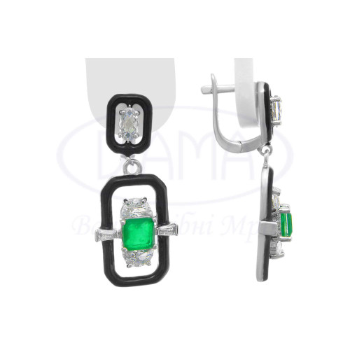 Срібні сережки з зеленим та білим цирконом, а також чорною емаллю у формі прямокутника. Срібло 925 проби, покрите родієм. В наборі присутні каблучка, сережки та підвіска.