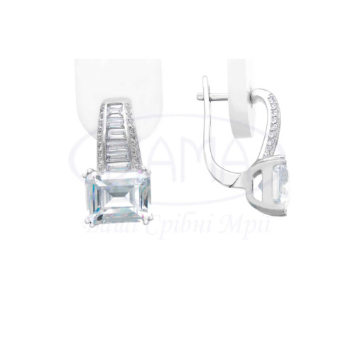 Сережки срібні з білим прямокутним цирконом. Срібло 925 проби, покрите родієм. В комплекті каблучка, підвіска та сережки. Розмір головного елемента 9мм × 10,5мм