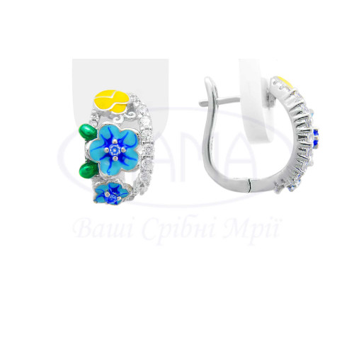 Сережки срібні у формі квітів з блакитною емаллю та білим цирконом. Срібло 925 проби, покрите родієм. В наборі присутні також каблучка та підвіска.