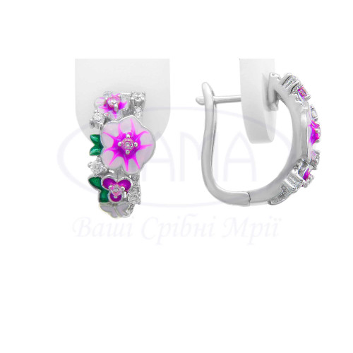 Сережки срібні з квітами покритими рожевою емаллю та білим цирконом. Срібло 925 проби, покрите родієм. В наборі присутні також каблучка та підвіска.
