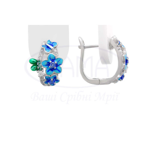 Сережки срібні з квітами покритими блакитною емаллю та білим цирконом. Срібло 925 проби, покрите родієм. В наборі присутні також каблучка та підвіска.