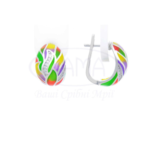 Срібні сережки з кольоровою емаллю та білим цирконом. Срібло 925 проби, покрите родієм. В комплекті каблучка, сережки та підвіска.