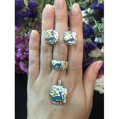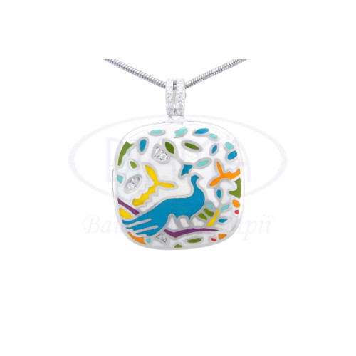 Срібна підвіска з кольоровою емаллю, на якій зображений павич та білим цирконом. Срібло 925 проби, покрите родієм. В комплекті каблучка, сережки та підвіска.