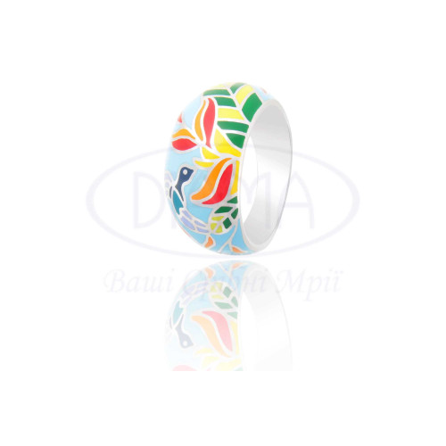 Срібна каблучка з кольоровою емаллю із зображенням птаха та гілок з листям. Срібло 925 проби, покрите родієм. В комплекті каблучка, сережки та підвіска.