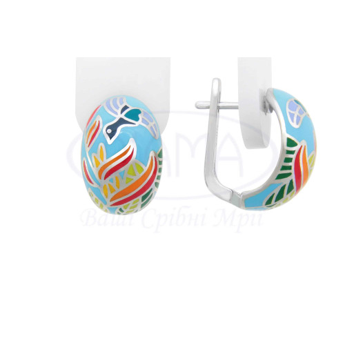 Срібні сережки з кольоровою емаллю із зображенням птаха та гілок з листям. Срібло 925 проби, покрите родієм. В комплекті каблучка, сережки та підвіска.