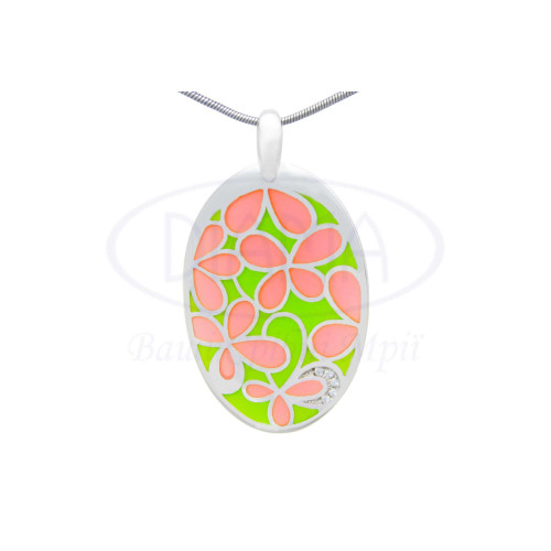 Срібна підвіска з кольоровою емаллю із зображенням квітів та білим цирконом. Срібло 925 проби, покрите родієм. Розмір підвіски 22х31 мм. В комплекті каблучка, сережки та підвіска.