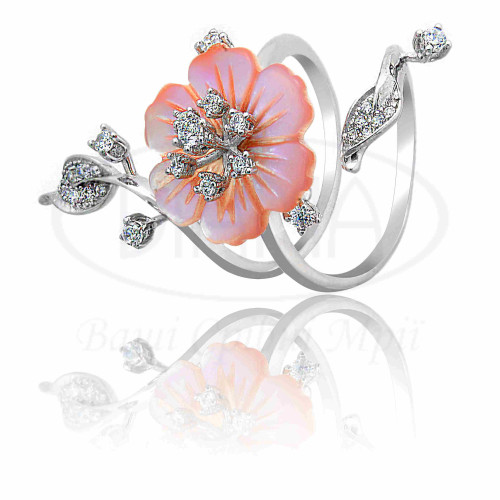 Каблучка срібна з кольоровим цирконом та перламутром, в стилі Роберто Браво. Срібло 925 проби, покрите родієм. В наборі присутні каблучка, сережки та підвіска.