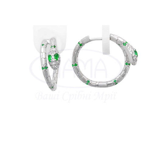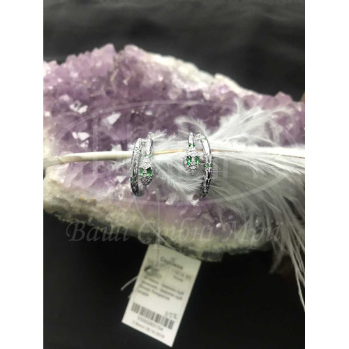 Срібні сережки з білим та зеленим цирконом в формі Змії. Срібло 925 проби, покрите родієм. В наборі є каблучка та сережки.
