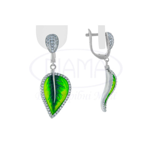 Сережки срібні у формі листя з зеленою емаллю та білим цирконом. Срібло 925 проби, покрите родієм. В комплекті каблучка, сережки та підвіска.