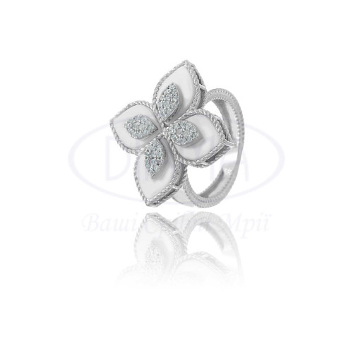 Каблучка срібна в формі квітки з білим перламутром та цирконом. Срібло 925 проби, покрите родієм. В наборі присутні каблучка та сережки