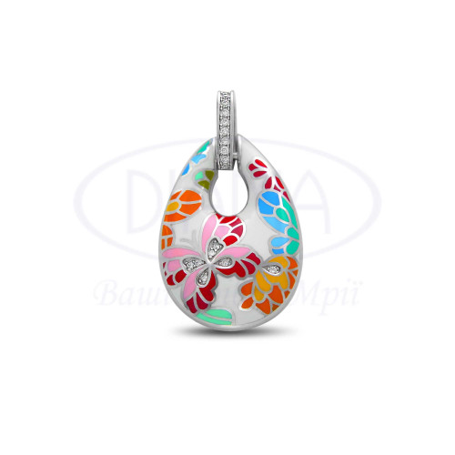 Срібна підвіска з кольоровою емаллю у вигляді метелика та білим цирконом. Срібло 925 проби, покрите родієм. Розмір підвіски 21х29,5 мм. В комплекті каблучка, сережки та підвіска.