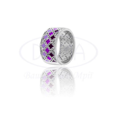 Срібна каблучка з кольоровою емаллю та білим цирконом із зображенням ромбів. Срібло 925 проби, покрите родієм. В комплекті каблучка, сережки та підвіска. Ширина каблучки 10,5 мм.