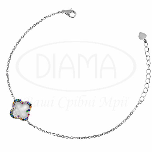 Браслет срібний з білим перламутром та кольоровим цирконом в формі "Клевер". Срібло 925, покрите родієм. В наборі присутні каблучка, сережки, підвіска, браслет та кольє. Розмір головного елементу 14 мм.
