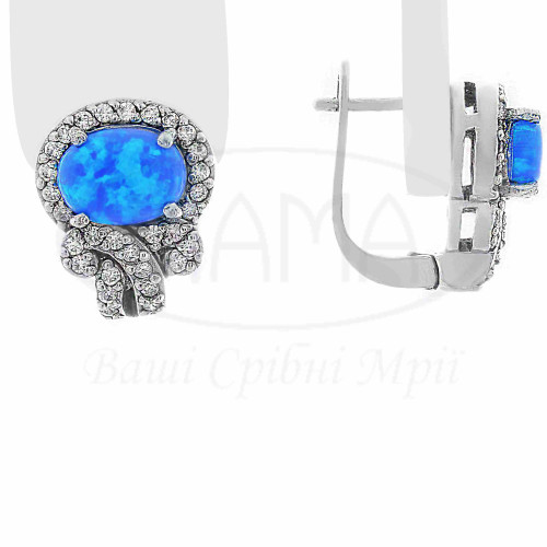 Сережки срібні з синім опалом та білим цирконом. Срібло 925 проби, покрите родієм. В комплекті каблучка та сережки.