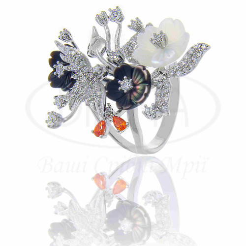 Каблучка срібна в стилі Роберто Браво у формі квітів. Срібло 925 проби, покрите родієм. Вставка: перламутр, мікс циркону. Комплект складається з каблучки, підвіски та сережок.