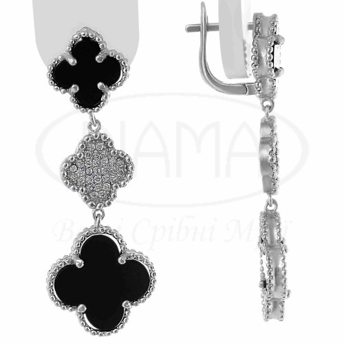 Срібні сережки з Оніксом та цирконом. Срібло 925 проби, покрите родієм. Комплект виготовлений в формі "Клевер", складається з сережок, браслету та кольє.