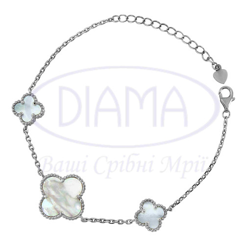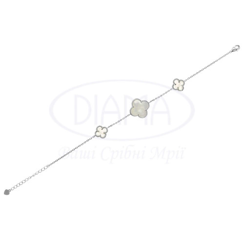 Срібний браслет з білим Перламутром. Срібло 925 проби, покрите родієм. Комплект виготовлений в формі "Клевер", складається з браслету та кольє. Розмір головного елементу браслета 11 та 18 мм.