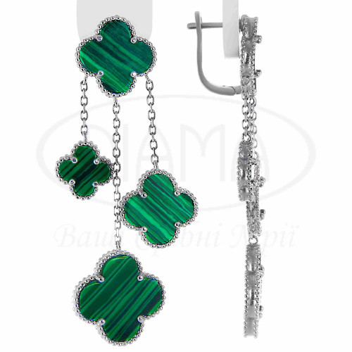 Сережки срібні з Малахітом. Срібло 925 проби, покрите родієм. Сережки виготовлено в формі "Клевер". Розмір головних елементів - 18 мм, 15 мм та 11 мм.