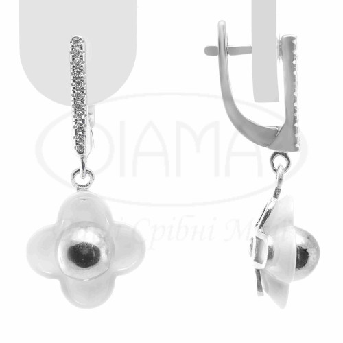 Сережки срібні з білою керамікою у формі "Клевер" та білим цирконом. Срібло 925 проби, покрите родієм. В наборі присутні каблучка, сережки та підвіска.