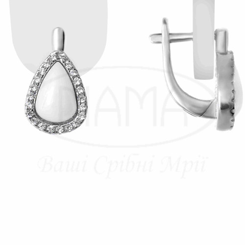 Сережки срібні з білою керамікою та білим цирконом у формі краплі. Срібло 925 проби, покрите родієм. Комплект складається з каблучки, підвіски та сережок.
