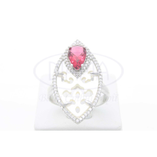 Срібна каблучка з білим перламутром, червоним та білим цирконом. Срібло 925 проби, покрите родієм. В комплекті присутні каблучка, підвіска та сережки.