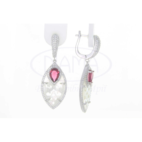 Срібні сережки з білим перламутром, червоним та білим цирконом. Срібло 925 проби, покрите родієм. В комплекті присутні каблучка, підвіска та сережки.