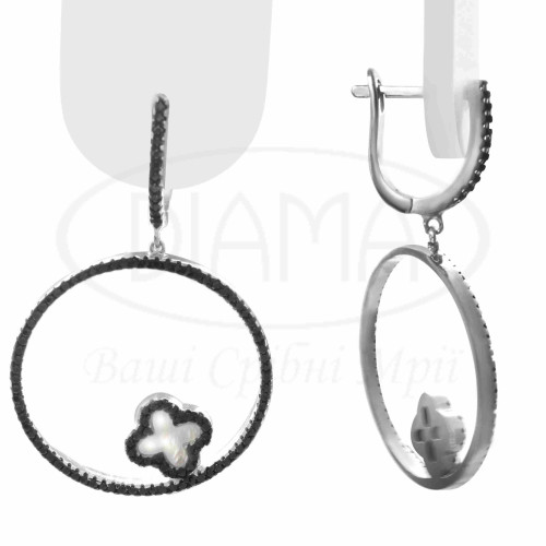 Сережки срібні з білим перламутром і чорним цирконієм в формі Конюшини. Срібло 925 проби, покрите родієм. В наборі є каблучка та сережки.