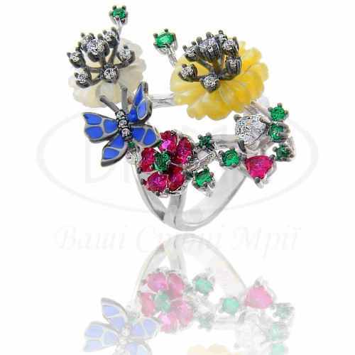 Срібна каблучка з кольоровим цирконом і перламутром. Срібло 925 проби, покрите родієм. В наборі присутні каблучка та сережки.