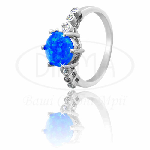 Каблучка срібна з синім круглим опалом та цирконом. Срібло 925 проби, покрите родієм. В наборі присутні Каблучка, сережки та підвіска.